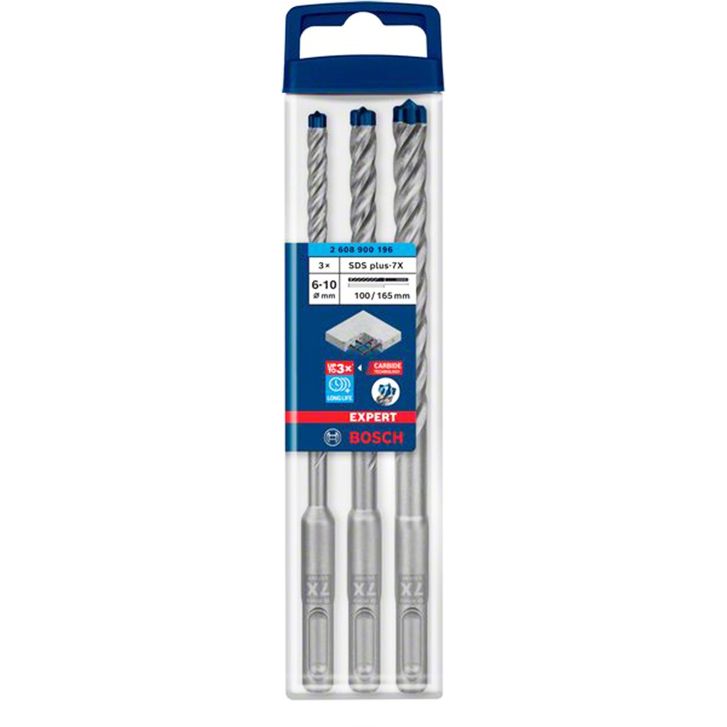 Das Experten-Tipp-Set Bosch SDS Plus 7X 6/8/10 mm 3Stk, für eine bis zu 3-mal längere Lebensdauer als eine normale Spitze.
