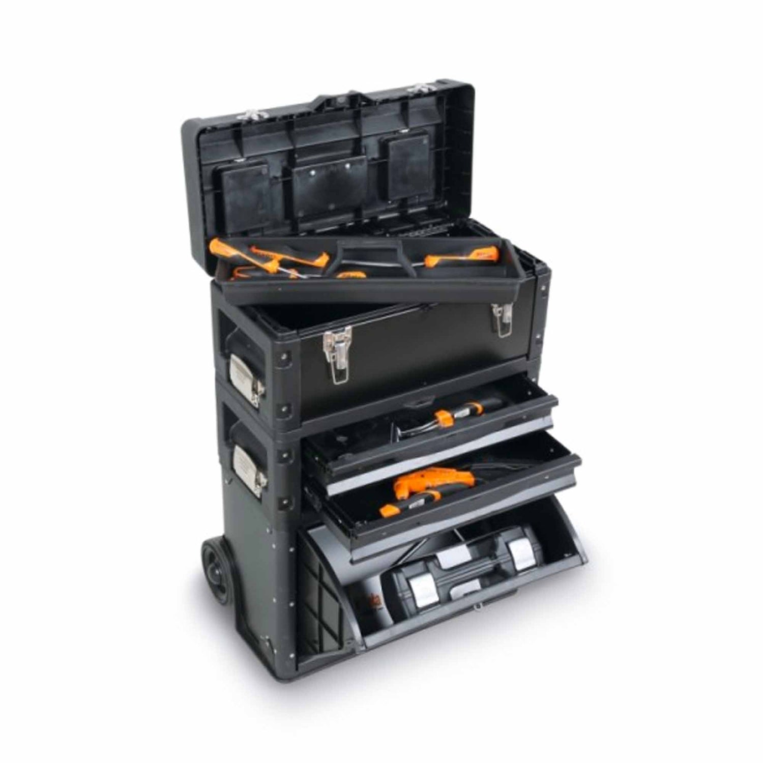 Der Wagen besteht aus 3 stapelbare Module und enthält 212 Universalwerkzeuge, perfekt für jede Art von Eingriff. Sein modularer Aufbau und die 128-mm-Räder machen ihn äußerst wendig und leicht zu transportieren, selbst auf den anspruchsvollsten Baustellen.