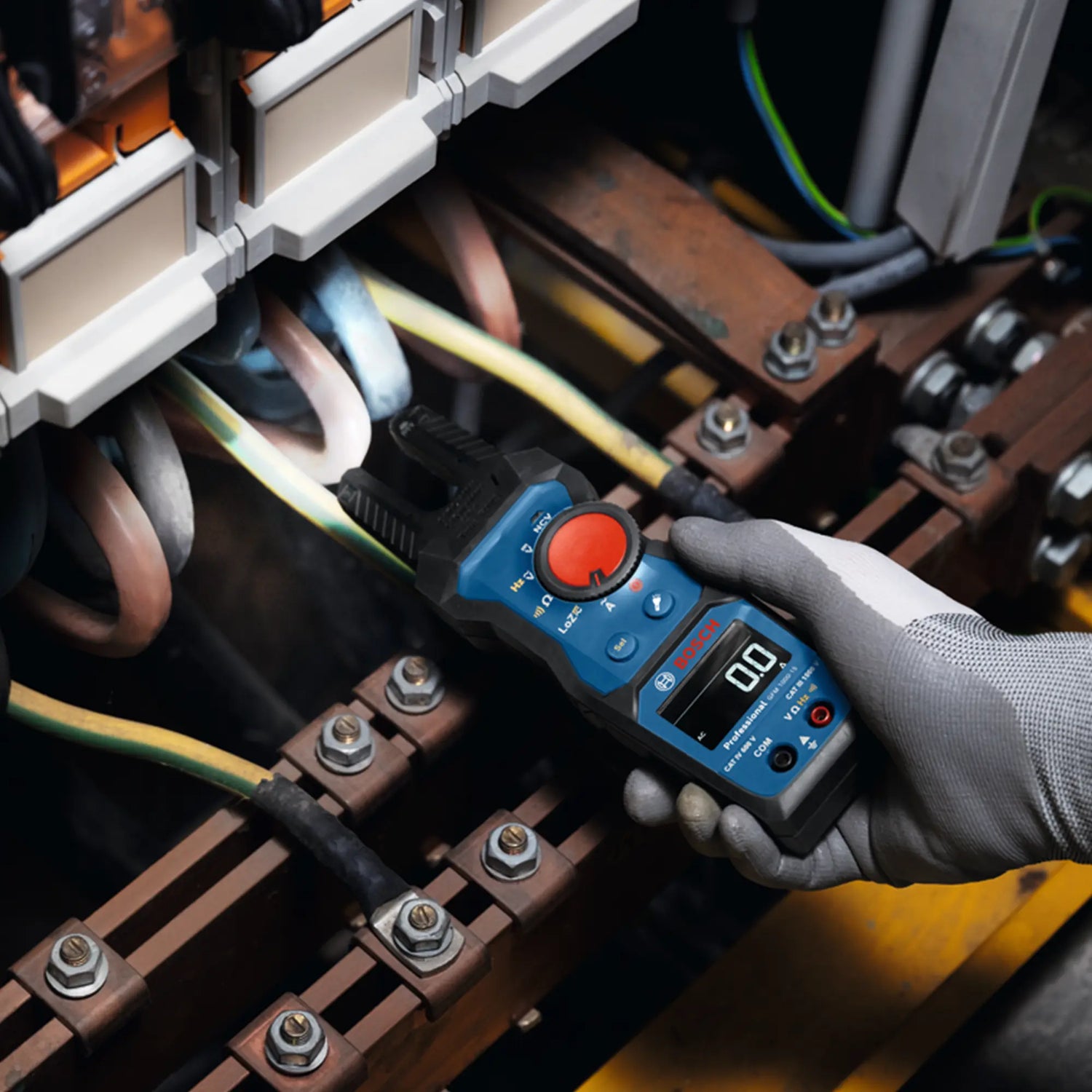 Die Stromklemme Bosch GFM 1000-15, ZuZuverlässiges und robustes True-RMS-Gabelamperemeter mit invertiertem LCD-Display zur schnellen Überprüfung des Wechselstroms.