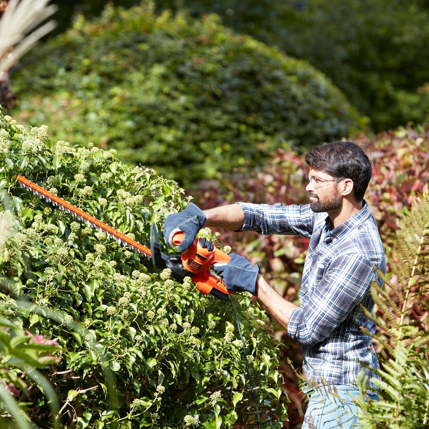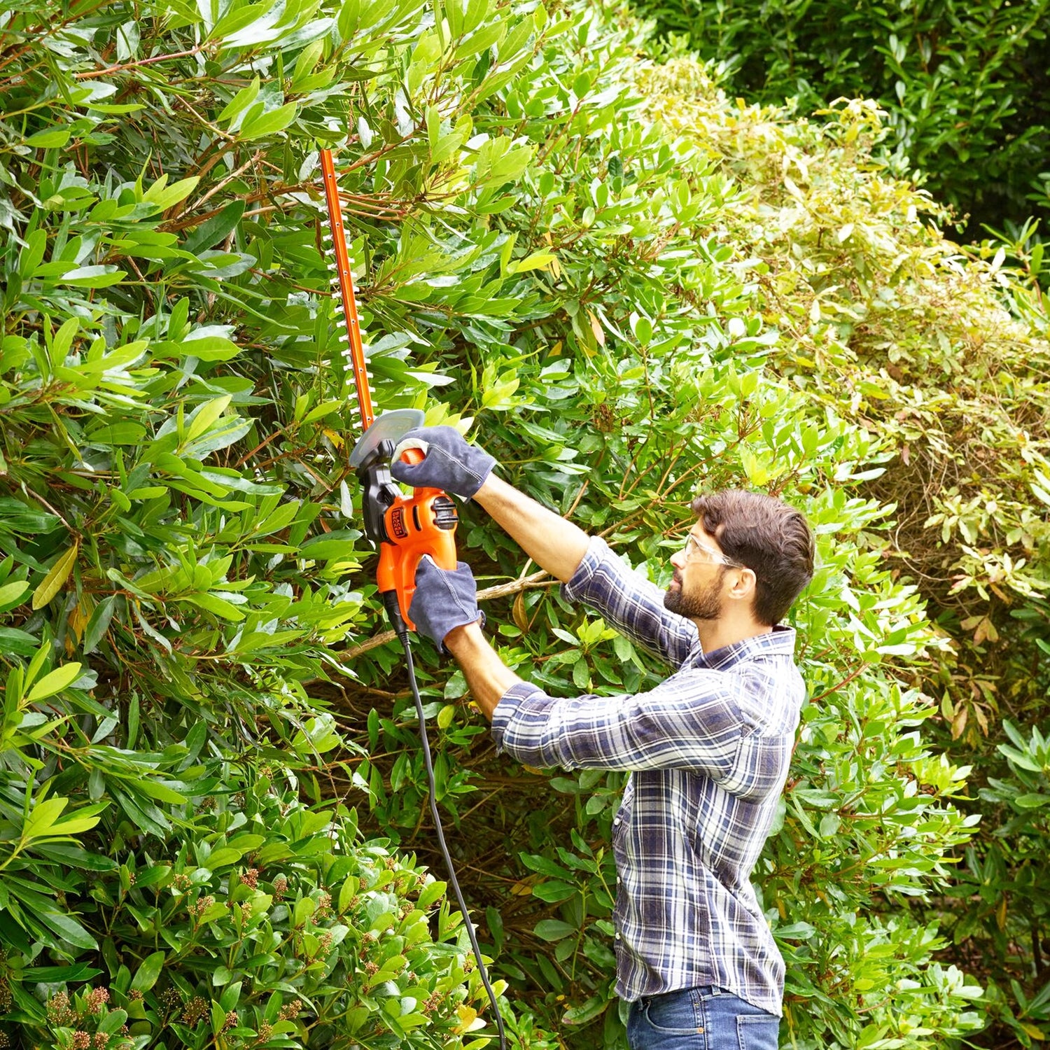 Die Heckenschere Black+Decker BEHT251-QS 450 W ideal zum Beschneiden kleiner Hecken, ausgewogene und kompakte Struktur für maximalen Komfort bei der Verwendung bei der Pflege der Hecke, T-Griff und Sicherheitsschutz für Sichtbarkeit beim Schneiden, um die Verwendung zu erleichtern.
