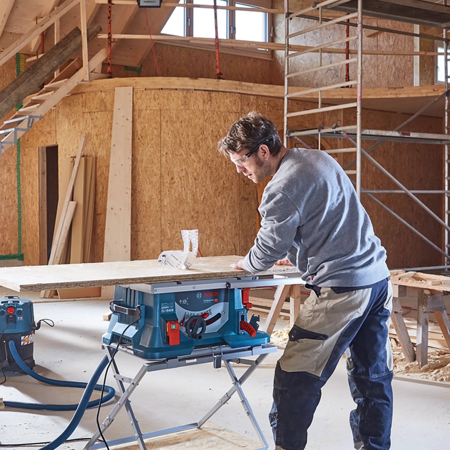 Der Werkbank Bosch GTA 560 Es ist die perfekte Unterstützung für alle, die Stabilität und Vielseitigkeit auf der Baustelle oder im Labor suchen, ideal für den Einsatz mit der Tischkreissäge Bosch GTS 635-216.