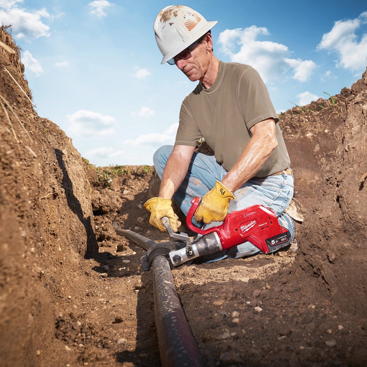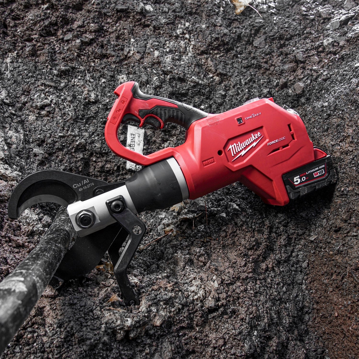 Kabelschneider Milwaukee M18 HCC75R-502C 18 V, 5 Ah, FORCE LOGIC kann Kabel mit 77,8 kN Kraft in weniger als 10 Sekunden schneiden. Die kabellose Fernbedienung kommuniziert über eine Bluetooth-Verbindung mit dem Werkzeug. Dadurch wird jede physische Verbindung zum Werkzeug entfernt und der Benutzer kann Fernschnitte aus bis zu 30 m Entfernung durchführen.