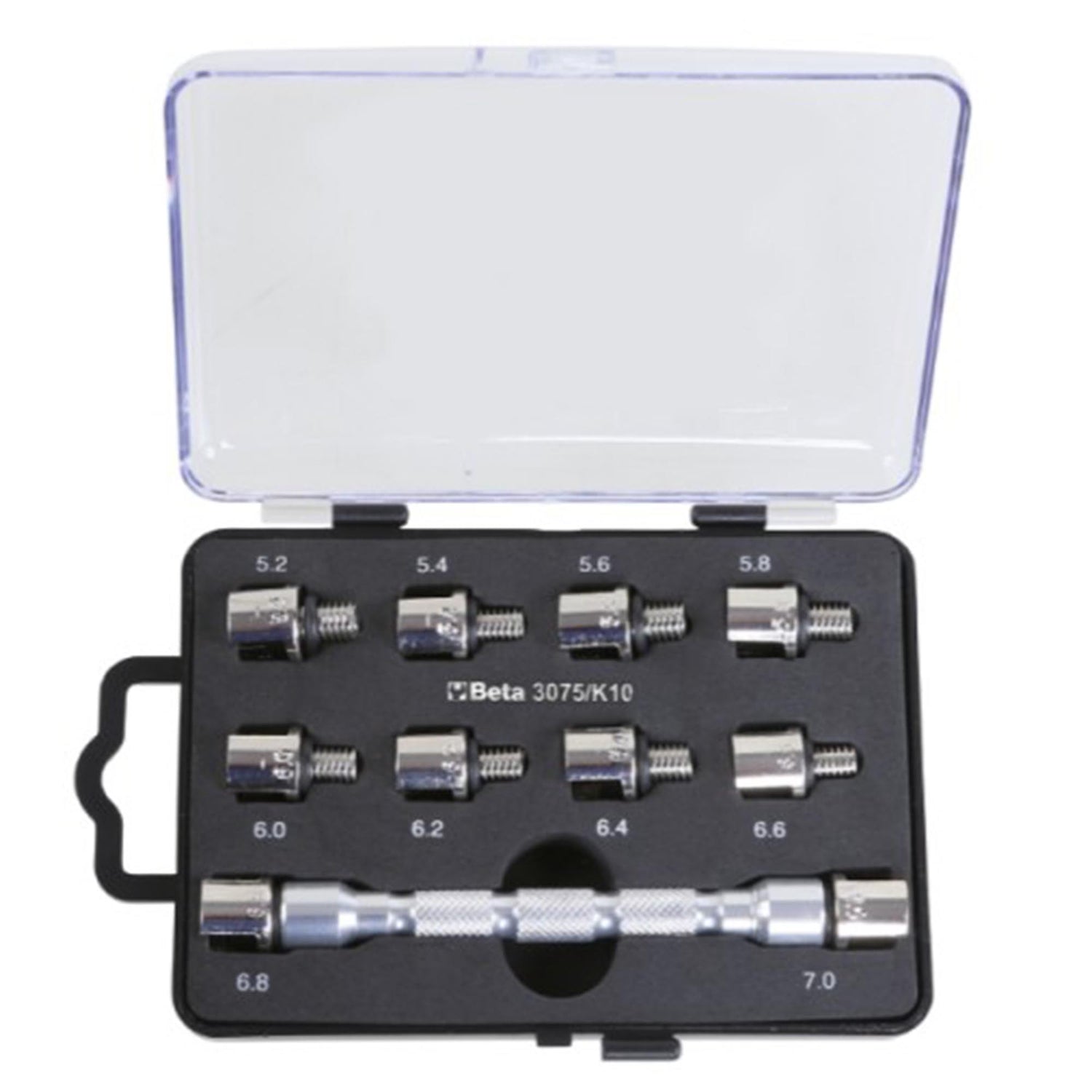 Der Universalschlüsselsatz mit auswechselbarem Kopf Beta 3075/K10 Es handelt sich um ein hochwertiges Profiwerkzeug zum präzisen Festziehen von Radspeichen. Dieses Set ist ideal für alle, die in Bereichen wie Mechanik und Wartung arbeiten, und bietet dank seiner 10 austauschbaren Einsätze, die ein breites Größenspektrum abdecken, Vielseitigkeit.