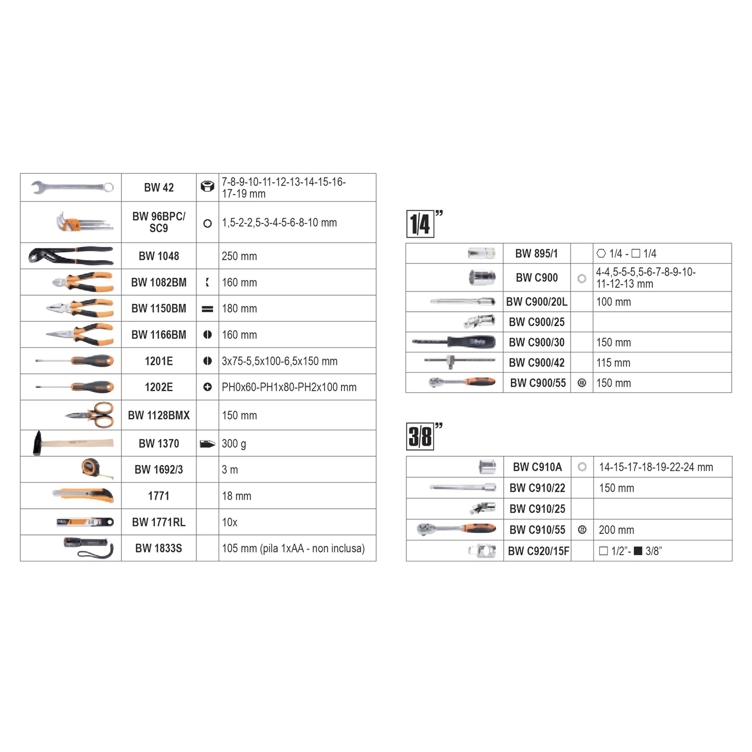 Wide Range of Tools: The 2054E 100 offers a complete set of 100 tools, while the BW 2054E-128 includes 128 tools to tackle general maintenance jobs efficiently and flexibly.