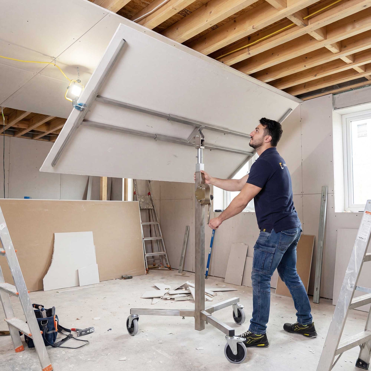 L’Akifix NAP01001 serve per il sollevamento e la posa controllata di lastre in cartongesso e pannelli leggeri. È utilizzato durante la realizzazione di controsoffitti e rivestimenti, consentendo anche a un solo operatore di posizionare le lastre in quota con precisione e sicurezza.