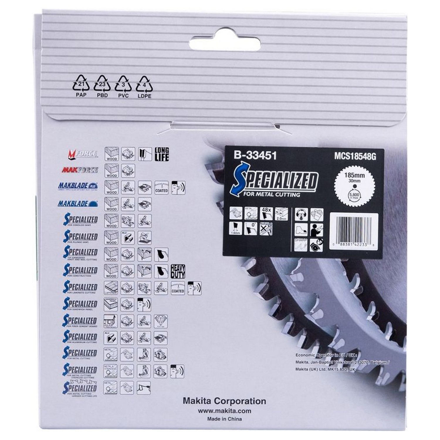 Lama Specialized TCT Makita B-33451 185x30mm 48T per taglio metallo professionale con denti in carburo di tungsteno e design anti-contraccolpo.
