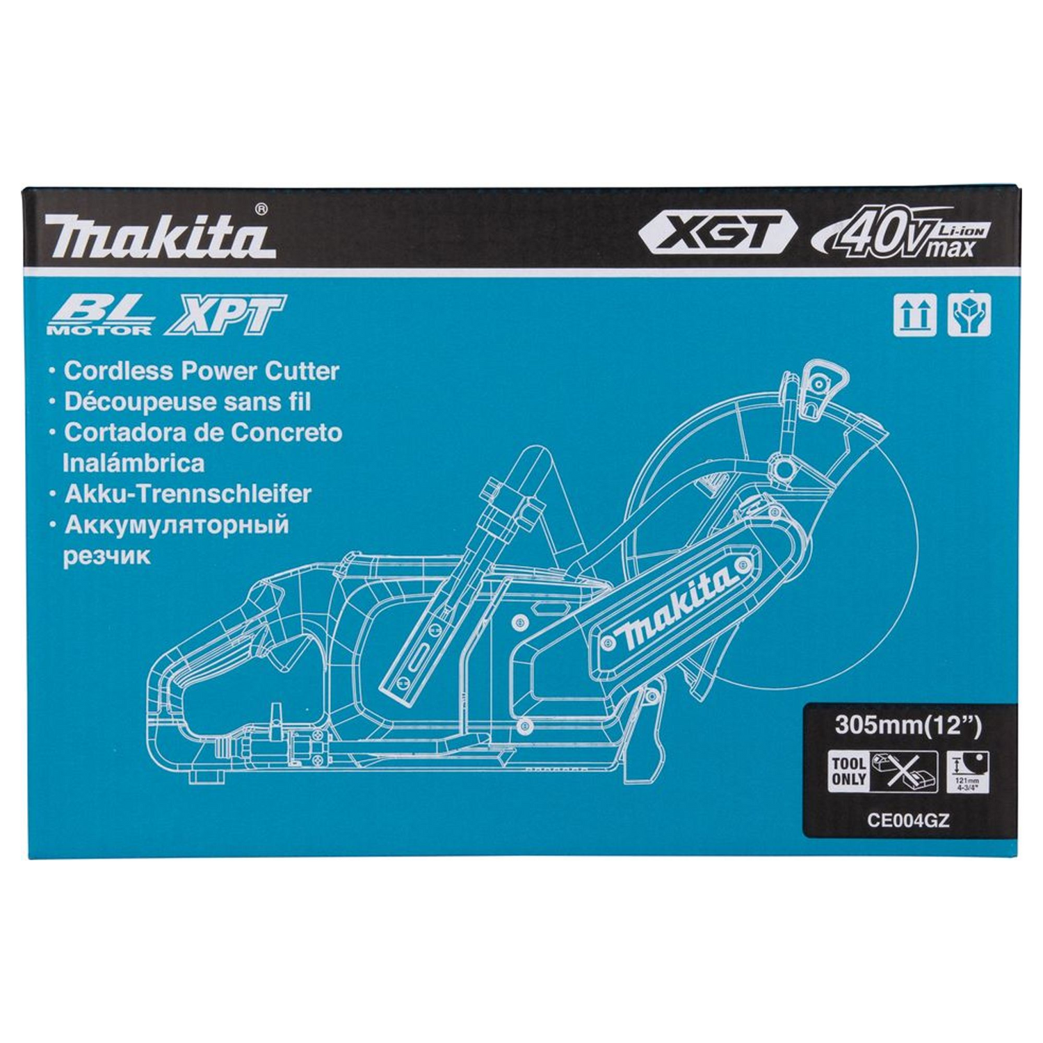 Troncatrice Makita CE004GZ 40V XGT con disco 305mm, freno elettrico e tecnologia AFT per cantieri civili e industriali con massima sicurezza.
