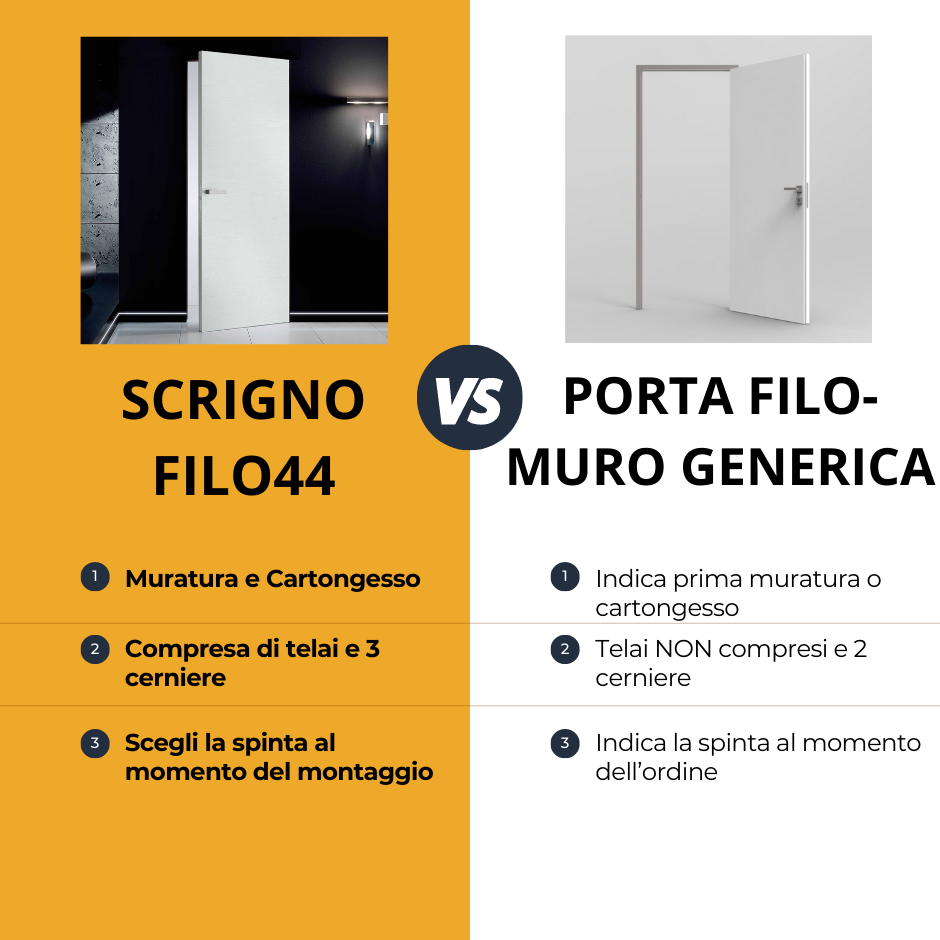 Vollständige Reversibilität: Der Bringt Scrigno Filo44 Es kann mit Rechts- oder Linksöffnung installiert werden, passt sich den Anforderungen der Baustelle an und ist auch nach der Installation veränderbar.