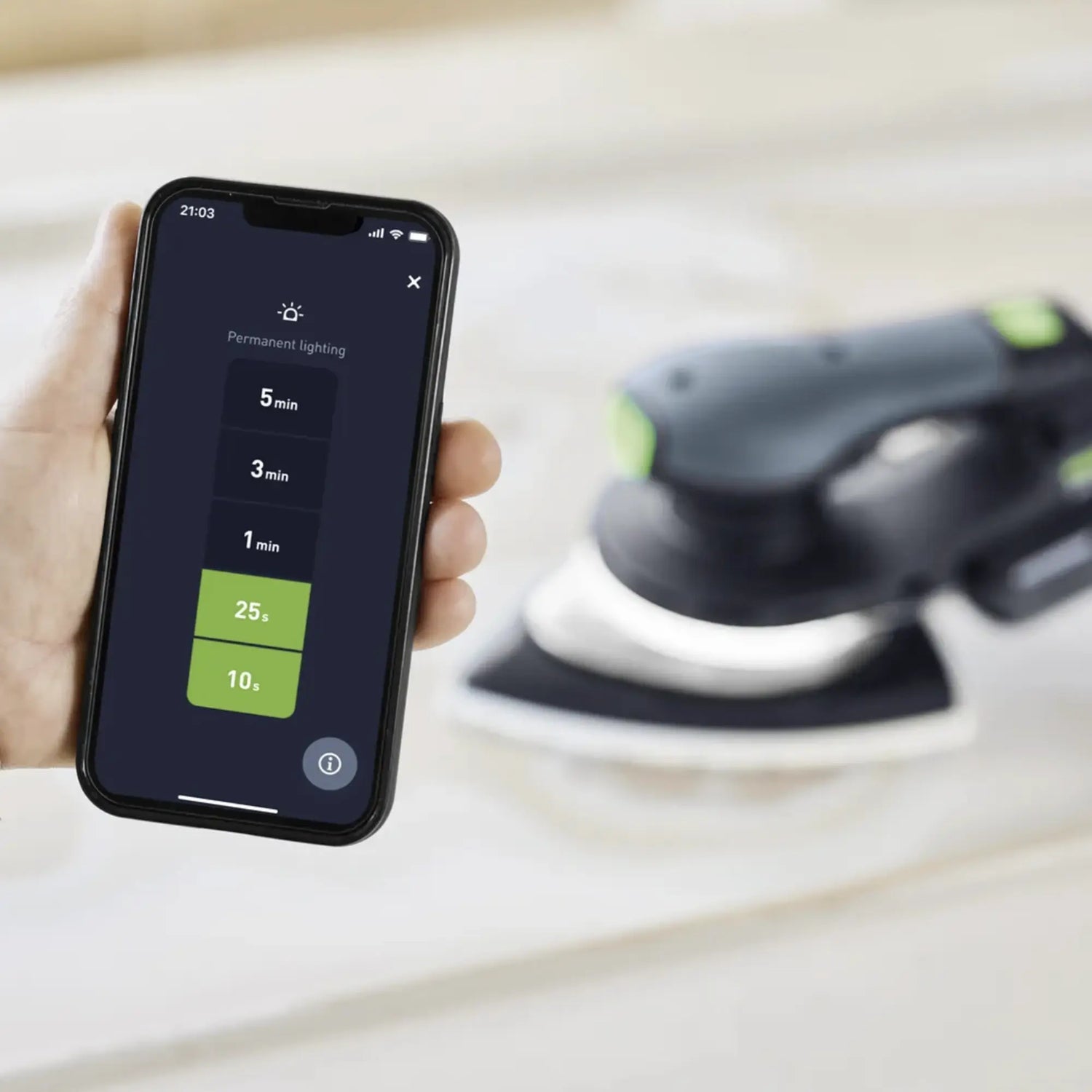 Der Delta Sander Festool DTSC 200 18V, präzise bis ins kleinste Detail, sogar nah am Rand mit LED-Beleuchtung.