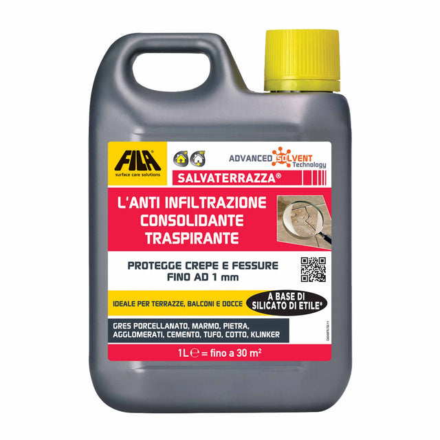 Anti-Infiltrations-Abdichtung Linie SALVATERRAZZA, festigend und atmungsaktiv. Ideal für Feinsteinzeug, Marmor und Stein, Agglomerate, Beton, Tuff, Terrakotta, Klinker.