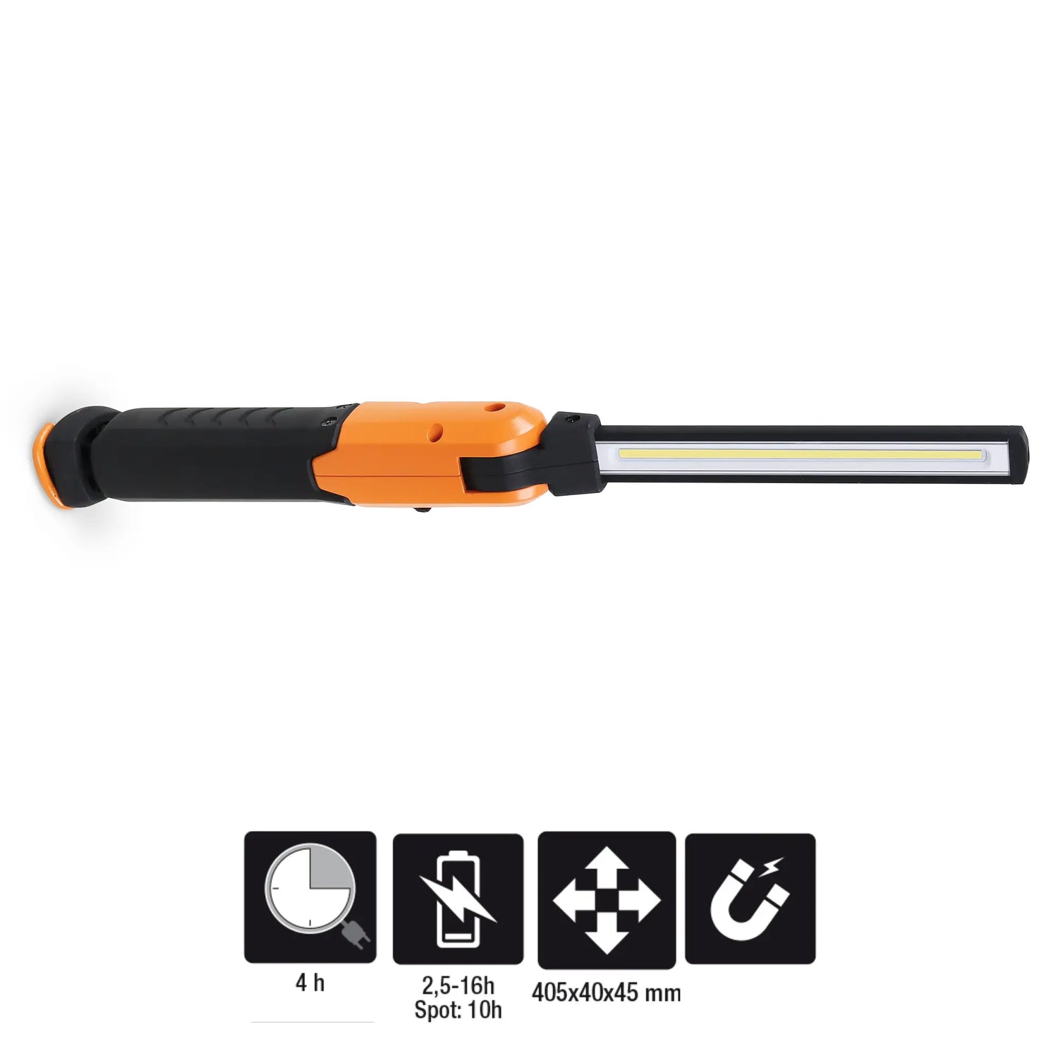Ausgestattet mit leistungsstarker Neodym-Magnetfuß, Drehhaken, Stufenlose Helligkeitsregulierung Und Staub-, Stoß- und Spritzwasserschutz, ist eine High-End-Handleuchte für den täglichen Einsatz in Werkstätten, auf Baustellen oder in technischen Anlagen.