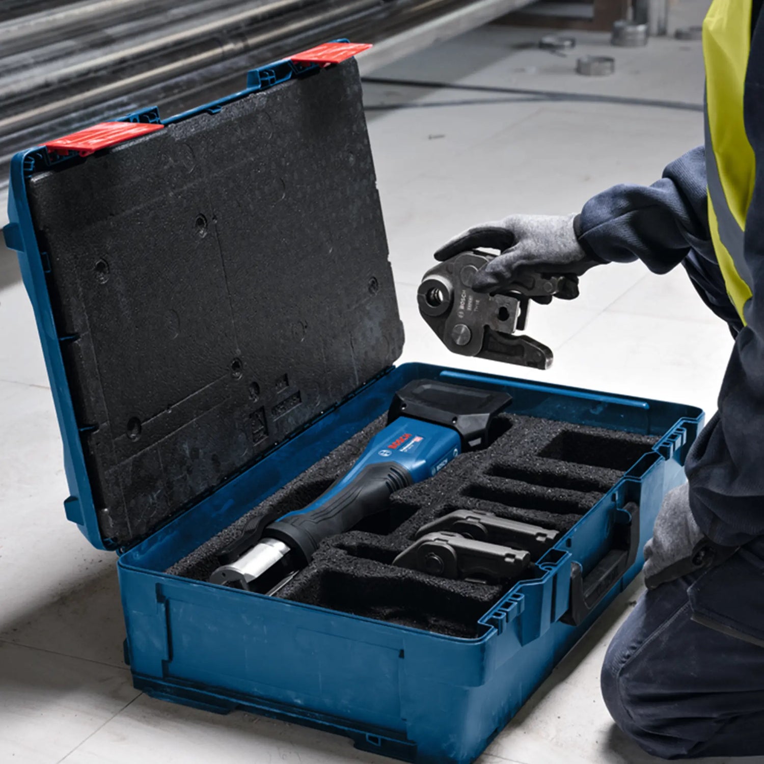 Pressmaschine Bosch GPT 18V-32 Professional 18V mit 32 kN Kraft, inklusive M15/M22/M28 Backen und kostenlosem Akku. Schnelle 5-Sekunden-Zyklen, 360°-Kopf.
