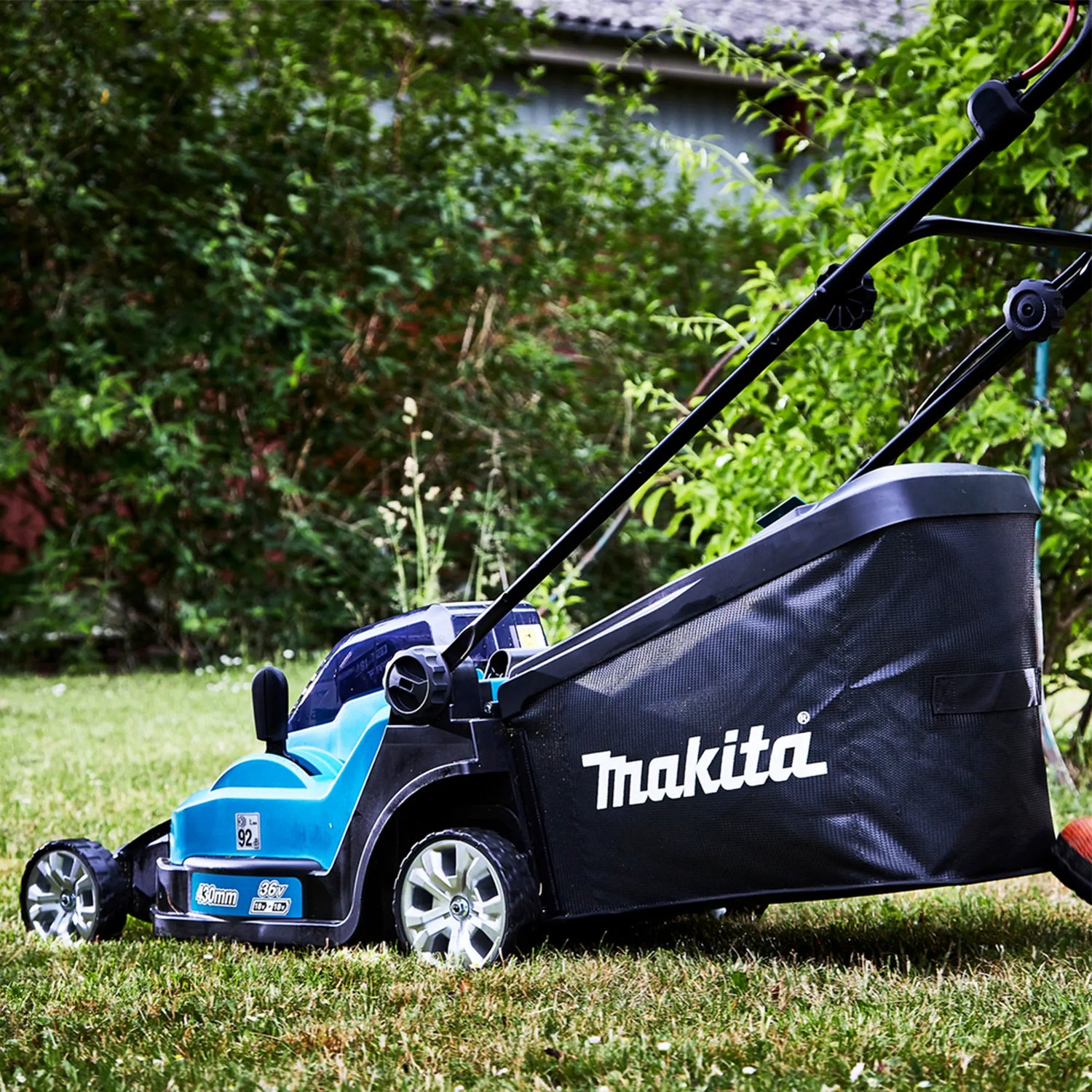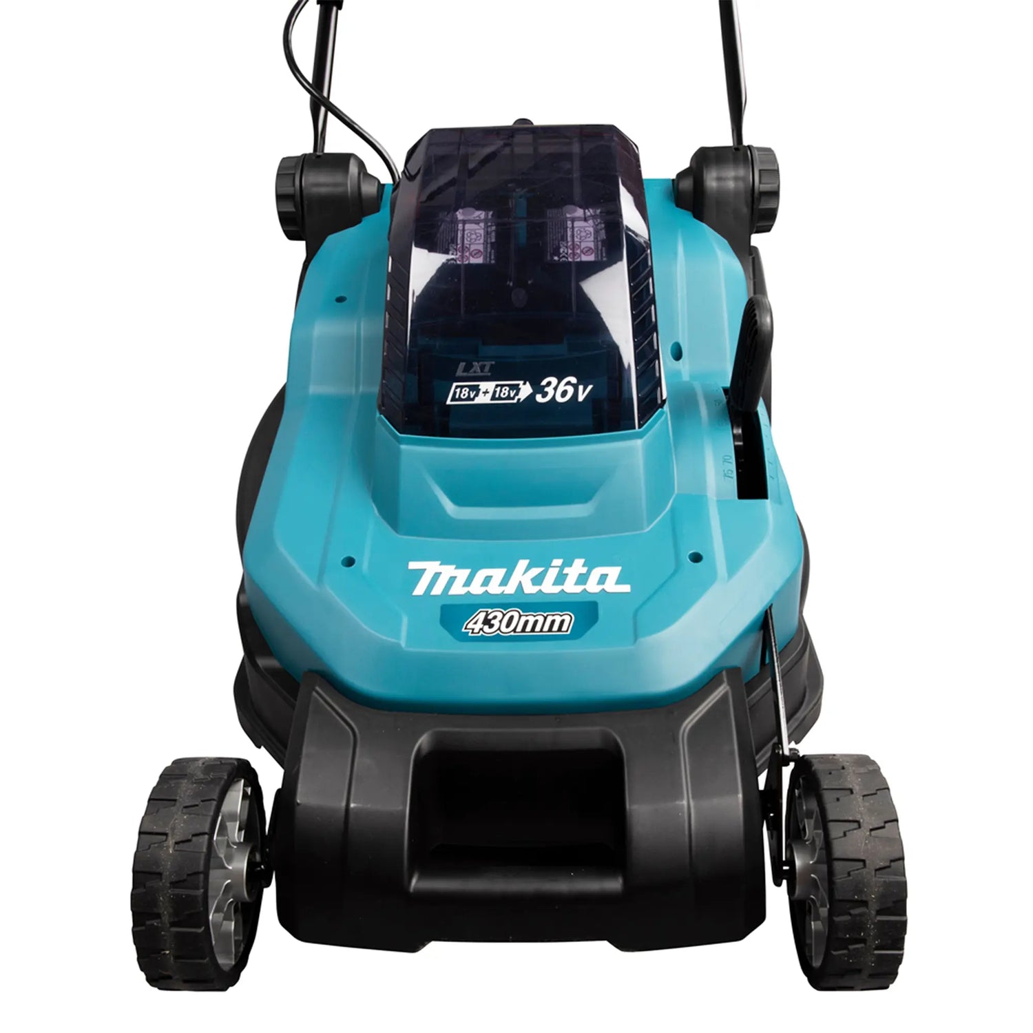 Der Rasenmäher Makita DLM432PT2 18 V x 2 5 Ah aus zwei 18-V-Batterien, um eine maximale Leistung von 36 V zu erzielen. Ideal für den professionellen Einsatz im Wohnbereich.