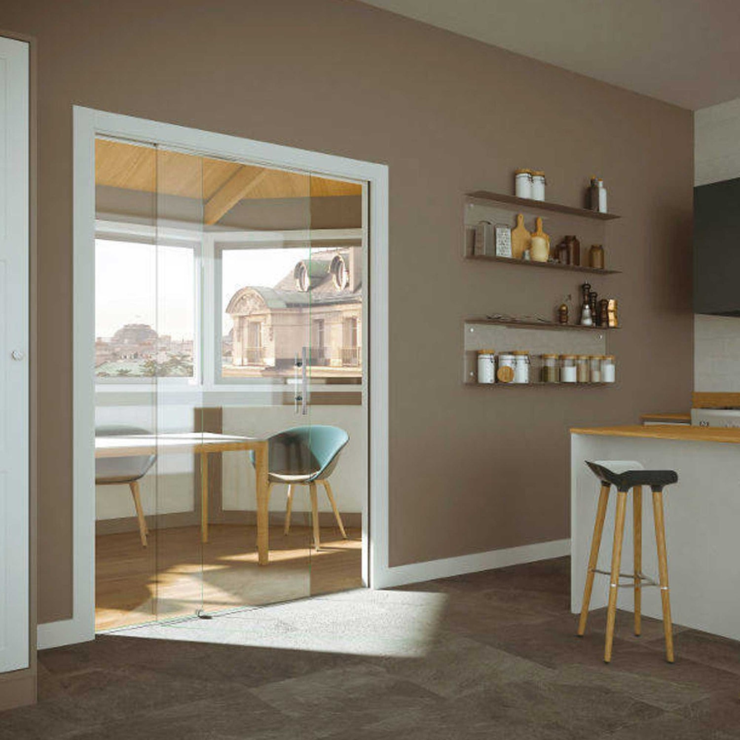 • Elegantes Design: Mit ihren Glasoberflächen und der leichten Bewegung verleiht die Tür jeder Umgebung einen Hauch von Eleganz.