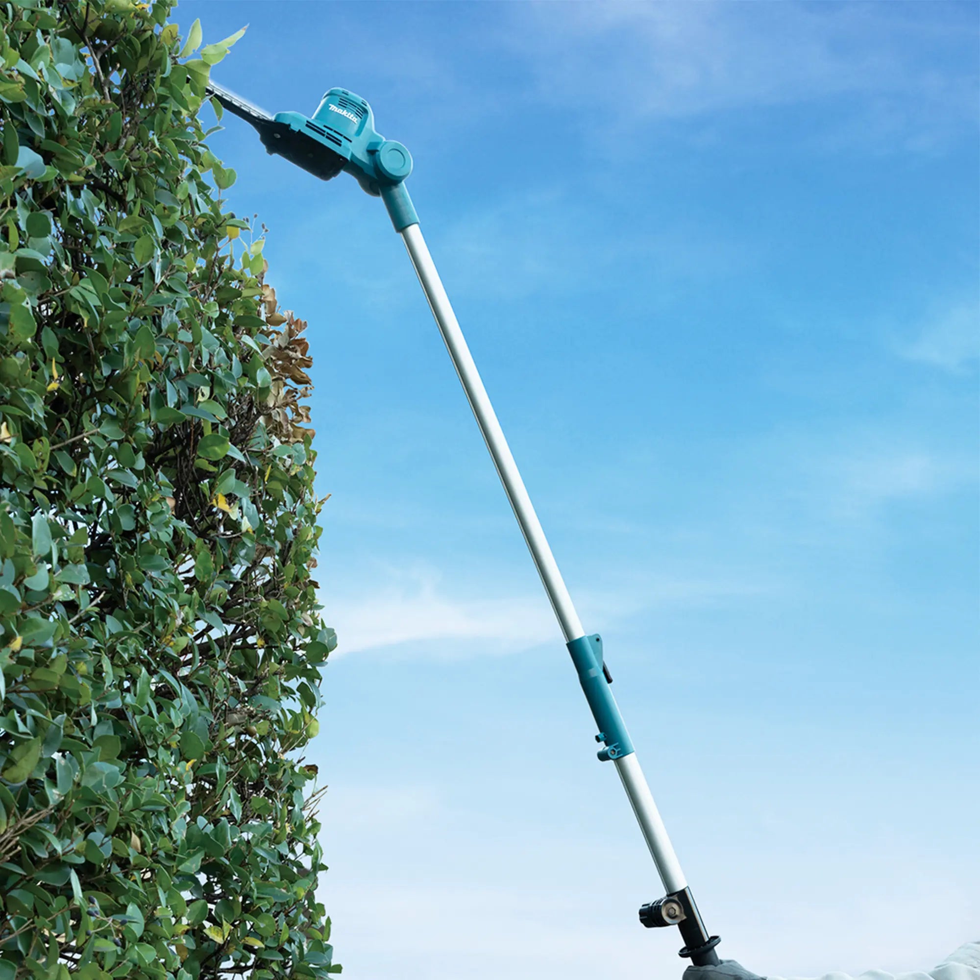 Teleskop-Heckenschere Makita DUN461WZX1 18 V, es wird vorgeschlagen Zum Heckenschneiden im privaten und öffentlichen Bereich. Der große Ausleger ermöglicht das Arbeiten an über 2 Meter hohen Hecken.