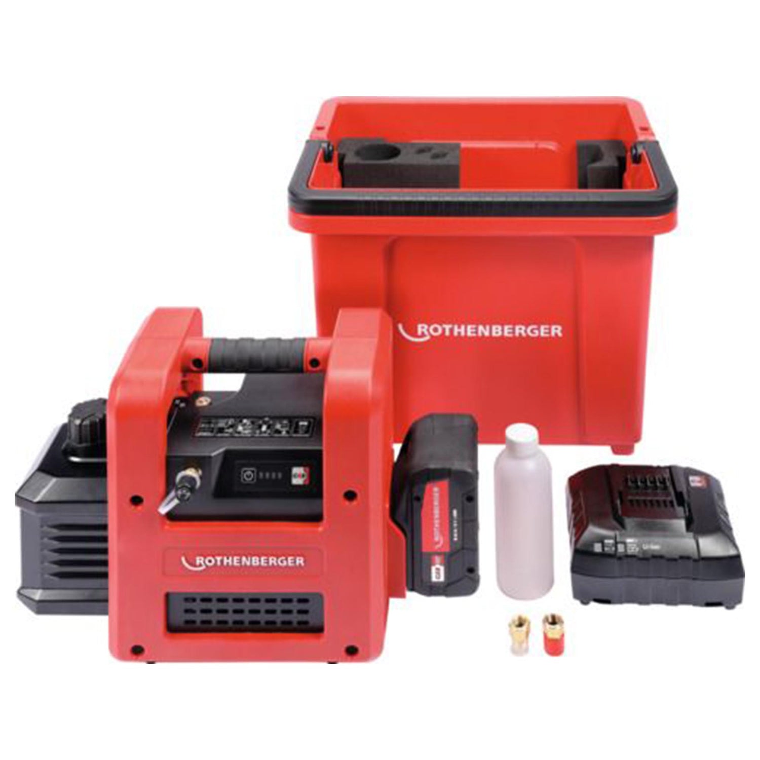 Vakuumpumpe Rothenberger R32 5,0 CL, ideal für den Einsatz auf Baustellen und an Orten ohne Elektrizität. Mit den neuen akkubetriebenen Vakuumpumpen ist es ab heute möglich, mit einer Akkuladung bis zu 90 Minuten zu arbeiten.