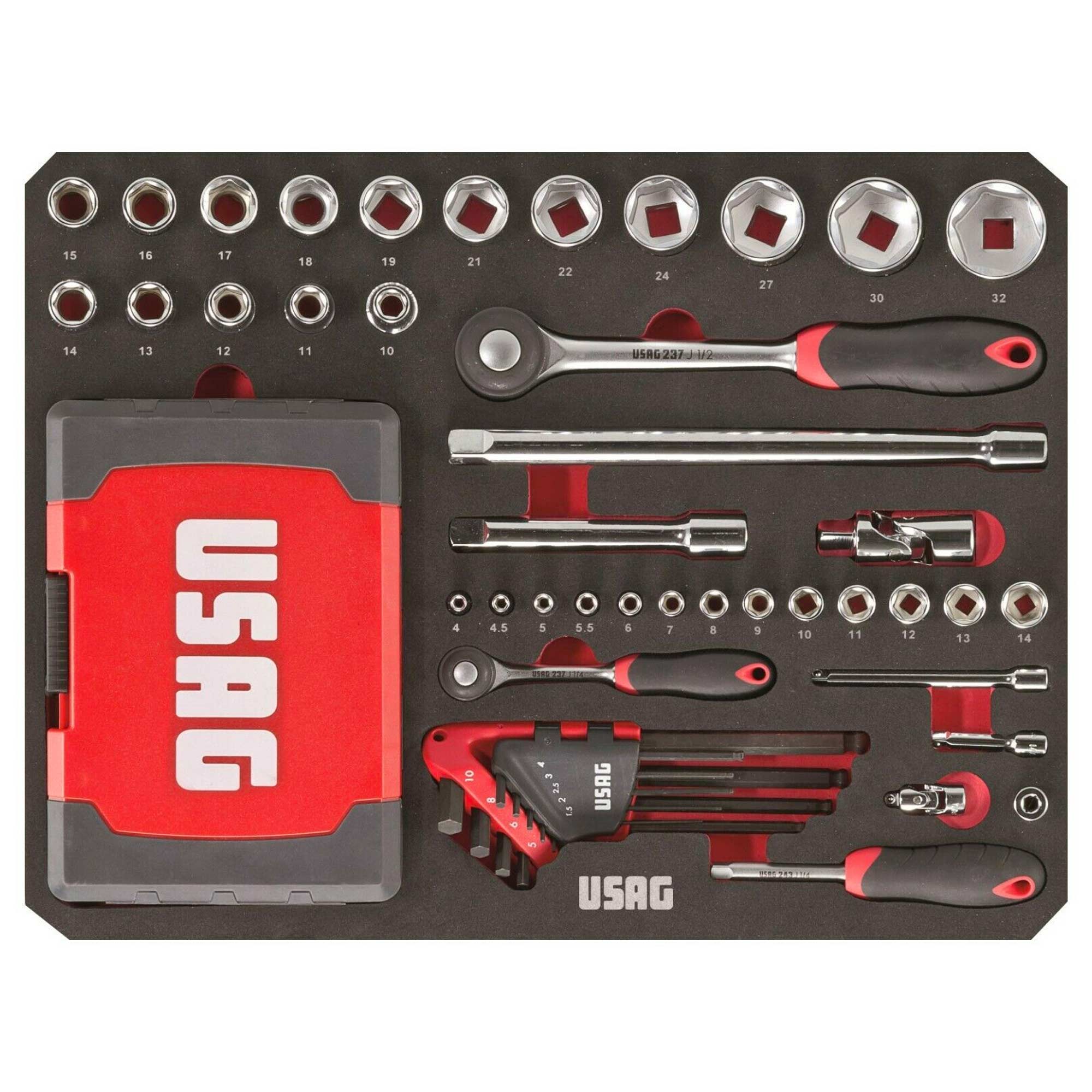 Dank seiner 3 interne Werkzeugtafelnfindet jedes Werkzeug passgenau seinen Platz, das vermeidet Unordnung und sorgt für eine schnelle Identifikation des benötigten Werkzeugs. Die Werkzeugsilhouetten auf dem zweifarbigen Formschaum und die Markierungen auf den Schlüsseln und Buchsen machen diesen Koffer äußerst funktional und perfekt für Profis.